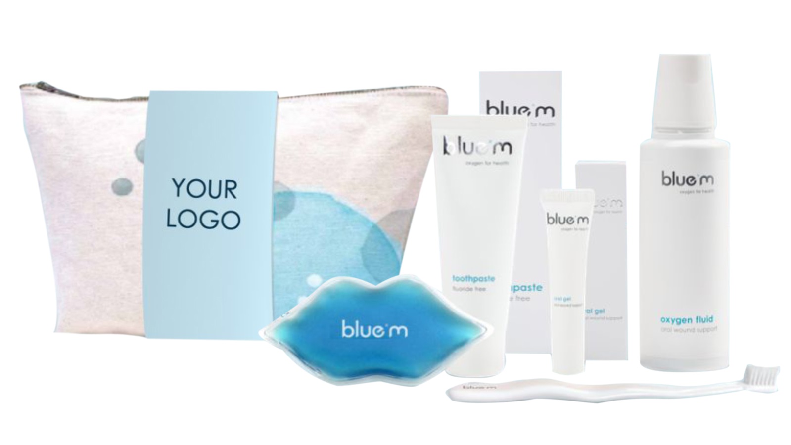 Set sadrži: Coolpack postoperacijski gel za hlađenje, Bluem oralni gel za njegu rana 1 x 15 ml, Bluem tekućina za ispiranje usta 1 x 250 ml, Bluem pasta za zube bez fluora 1 x 75 ml, Kirurška četkica za zube ultra soft blister pakiranje 1 x 1. Za narudžbe minimalno 100 kom ili više u mogućnosti smo napraviti personalizirani ovitak.