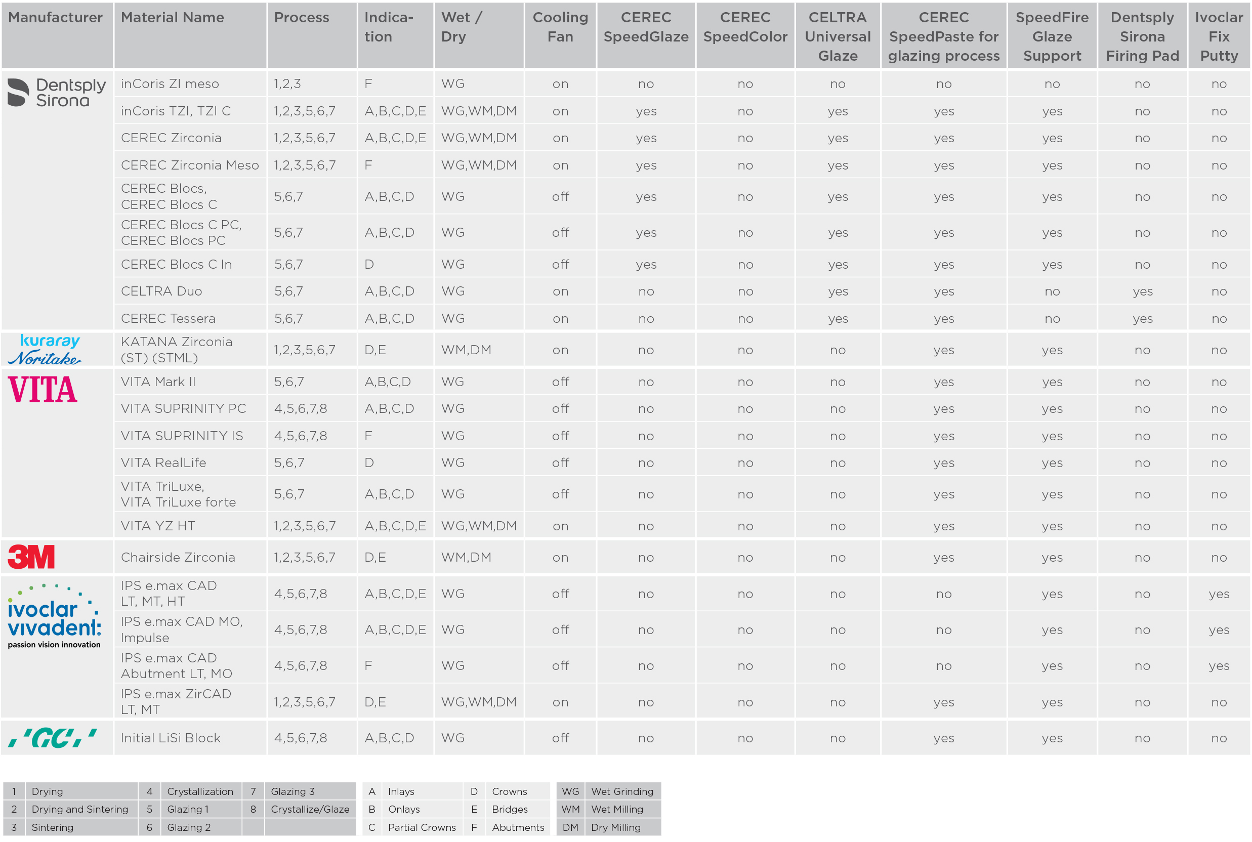 Popis kompatibilnih materijala za CEREC SpeedFire