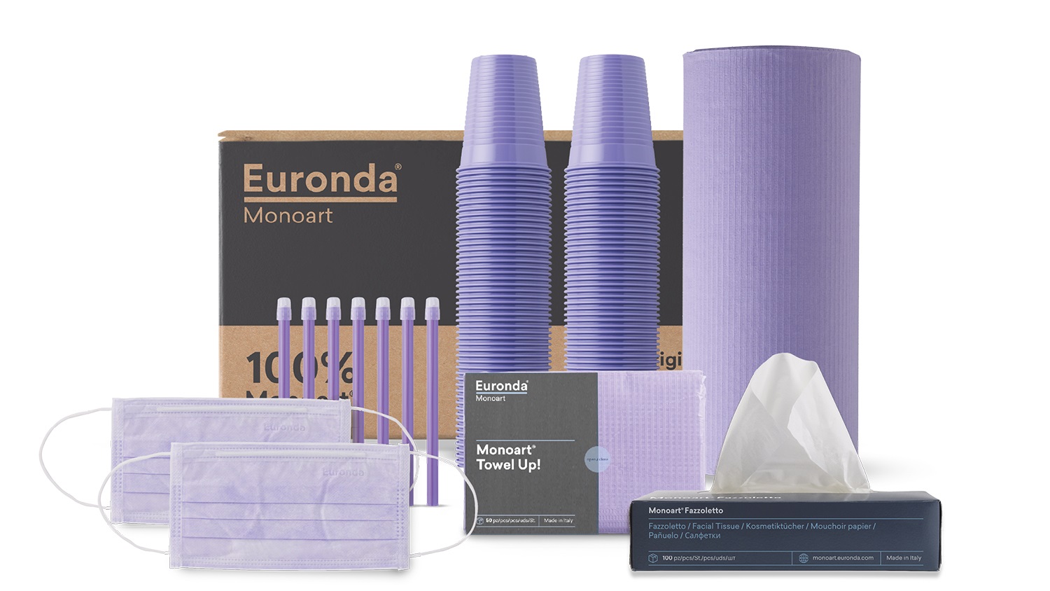 100 Monoart® pregača 100 Monoart® EM15 sisaljki 100 Monoart® čaša 100 Monoart® PTC3 maski 100 Monoart® Papirnatih maramica 80 Monoart® PG30 Aprons pregača